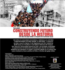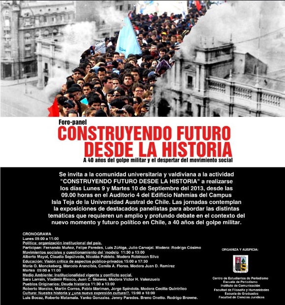 El Centro de Estudiantes de Periodismo en conjunto con la Escuela de Periodismo, el Instituto de Comunicación Social, la Escuela de Graduados de la Facultad de Filosofía y Humanidades con su Magíster en Comunicación, la Facultad de Filosofía y Humanidades y la Facultad de Ciencias Jurídicas y Sociales organizan en conjunto esta actividad enmarcada en la conmemoración de los 40 años del golpe militar en Chile.