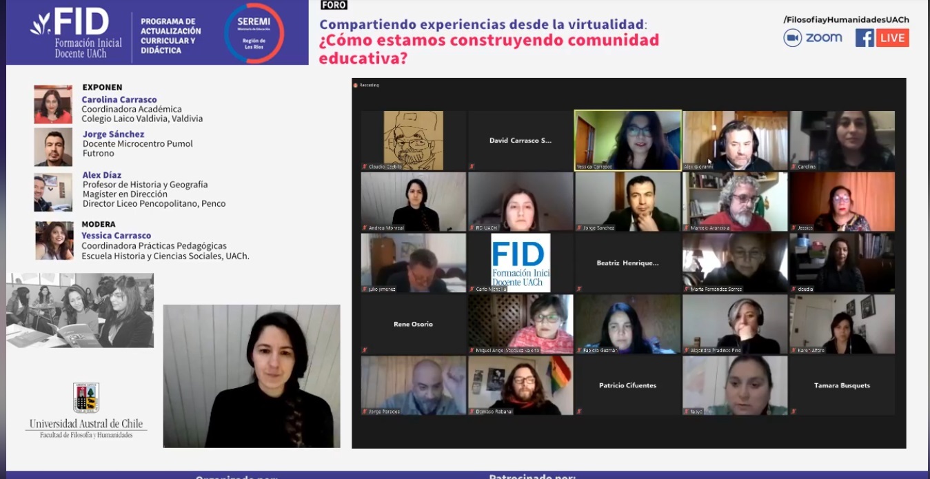Con una destacada participación de profesoras, profesores y equipos directivos de colegio se realizó el foro compartiendo experiencias desde la virtualidad ¿Cómo estamos construyendo comunidad educativa?, desarrollado el martes 18 de agosto por medio de zoom y transmitido por Facebook Live de la Facultad de Filosofía y Humanidades. La actividad contó con la participación de Carolina Carrasco, Coordinadora Académica del Colegio Laico de Valdivia, Jorge Sánchez, Docente Microcentro Pumol Futrono y Alex Díaz, director del Liceo Pencopolitano, comuna de Penco y fue moderado por Yesica Carrasco, Coordinadora Prácticas Pedagogías, Escuela de Historia y Ciencias Sociales.