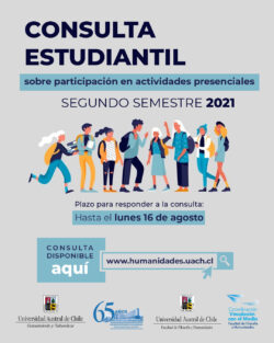 La Facultad de Filosofía y Humanidades de la Universidad Austral de Chile, invita a las y los estudiantes de sus siete carreras de pregrado y programa de formación de profesores a responder el siguiente cuestionario, sobre la participación en actividades presenciales con motivo de las modificaciones del Plan Paso a Paso y las disposiciones institucionales. Lo anterior, nos permitirá planificar y desarrollar las acciones necesarias para la implementación adecuada de actividades presenciales durante el segundo semestre 2021.