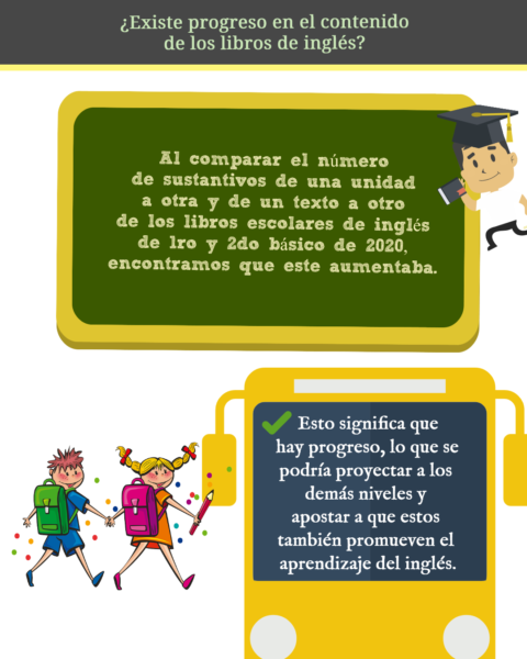 Las primeras conclusiones que dio este estudio es que los libros de texto estudiados (1ro y 2do básicos) construyen conocimiento en inglés relacionado con aspectos básicos de la experiencia humana, que los niños aprenden en su lengua materna en sus primeros años de vida, antes incluso de ir al colegio. Por ejemplo, los libros presentan contenidos léxicos relacionados con la familia, alimentos, animales, estaciones del año y fiestas, entre otros. De esta manera, se construye conocimiento nuevo en la lengua extranjera con base en conocimientos previos en la lengua materna.