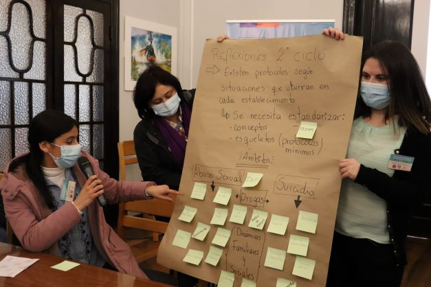 Durante la jornada de taller los participantes compartieron sus experiencias sobre las dificultades que han tenido con las y los estudiantes al regreso de las clases virtuales, centrando el énfasis en el trabajo en salud mental que han tenido que ir desarrollando a partir del contexto de pandemia. Los asistentes trabajaron en grupos donde a partir de distintas preguntas hicieron un diagnóstico y plan de trabajo para abordar este tema en sus respectivos contextos escolares.