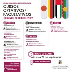 Ya se encuentra disponible la programación de la oferta de cursos optativos y facultativos ofrecidos por el Centro de Idiomas UACh para este segundo semestre de 2022. El período de inscripción de asignaturas para los estudiantes interesados deberá hacerse efectiva a través de info-alumno hasta este lunes 26 de septiembre.
