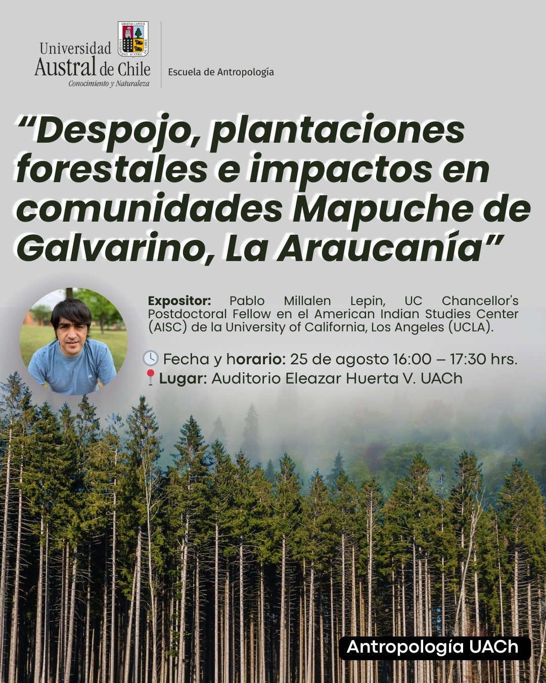 🌱 Invitamos a la comunidad universitaria y local a participar de la charla: “Despojo, plantaciones forestales e impactos en comunidades Mapuche de Galvarino, La Araucanía”.