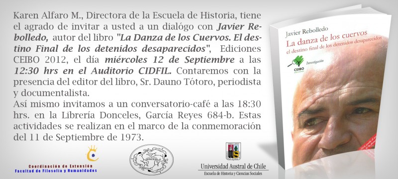 La Escuela de Historia y Ciencias Sociales invita a participar de la presentación del libro “La Danza de los Cuervos” este miércoles 12 de septiembre a las 12:30 horas en el Auditorio del CIDFIL. Javier Rebolledo, periodista y escritor del texto, estará presente junto al editor, Dauno Tótoro.