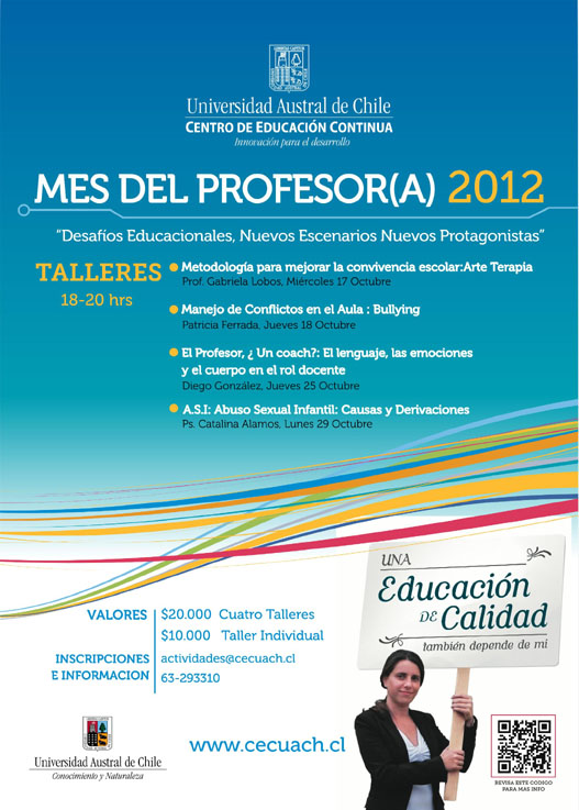 El ciclo comienza el 17 de octubre con el Taller “Metodologías para mejorar la convivencia escolar: Arte Terapia” que será dictado por la Profesora Gabriela Lobos, el Jueves 18 de octubre será el turno del Taller “Manejo de Conflictos en el Aula: Bullying” dictado por Patricia Ferrada, el Jueves 25 de octubre se dictará el Taller “¿El Profesor, un coach?: El lenguaje, las emociones y el cuerpo en el rol docente” para finalizar el Lunes 29 de octubre con la Charla Taller “A.S.I, Abuso Sexual Infantil: Causas y Derivaciones”. Dictado por la Psicóloga Catalina Álamos.