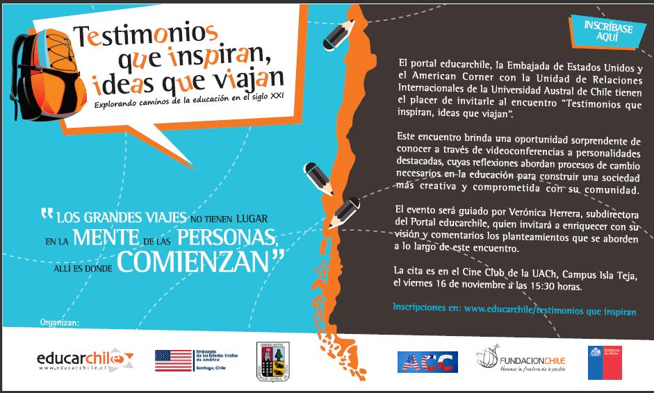 El portal educarchile, la Embajada de Estados Unidos junto al American Corner de la UACh invitan al encuentro que permitirá conocer, a través de videoconferencia, a importantes personalidades. La actividad se realizará el viernes 16 de noviembre a partir de las 15:30 horas, la inscripción se realiza en: www.educarchile.cl/testimoniosqueinspiran