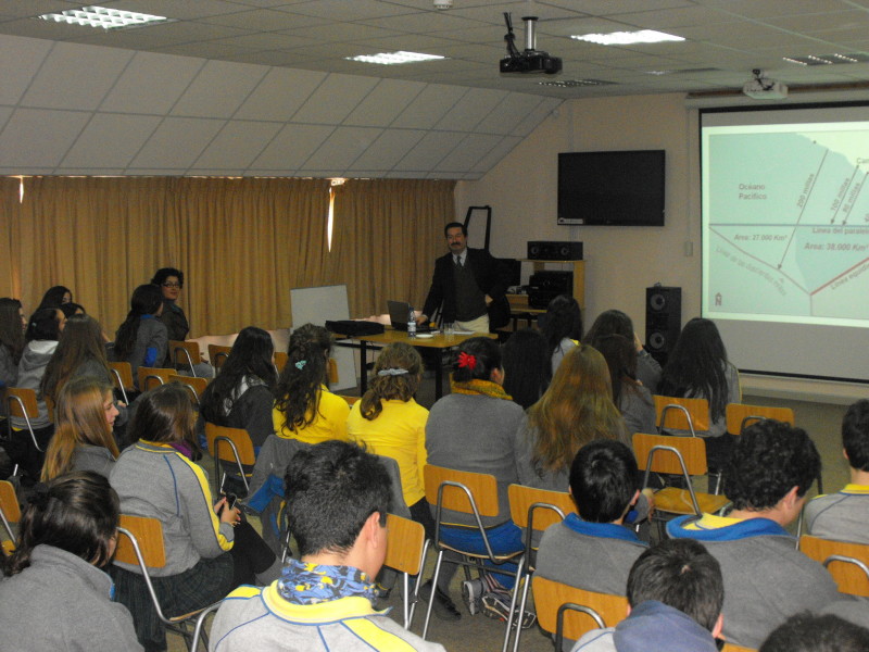 En dependencias de la sala multimedios y antes un gran número de estudiantes de enseñanza media del colegio, el docente, analizó las principales crisis políticas mundiales actuales, estudiando la perspectiva histórica del respectivo país, estado o nación, cruzándolo con su posición y características geográficas asociadas.