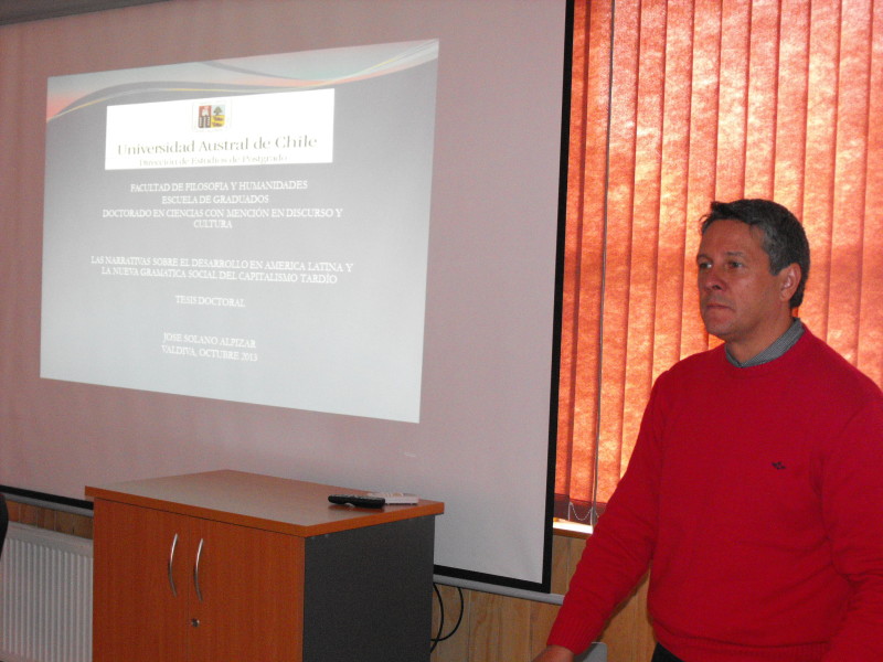 En dependencias de la sala de videoconferencias de la Escuela de Graduados el Dr. José Solano Alpizar expuso los detalles de la investigación de “Las narrativas sobre el desarrollo en América Latina y la nueva gramática social del capitalismo tardío”, tesis con la que obtuvo el grado de doctor en ciencias humanas, mención discurso y cultura, programa al que ingresó en el 2010.