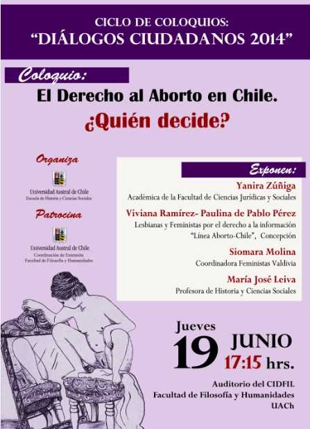 afiche coloquio abortoParticiparán de la actividad la académica de la Facultad de Ciencias Jurídicas y Sociales de la UACh, Yanira Zuñiga; las feministas por el derecho a la información “Línea Aborto-Chile” de Concepción, Viviana Ramírez y Paulina de Pablo Pérez; la coordinadora de Feministas de Valdivia, Siomara Molina; y, la profesora de historia y ciencias sociales, María José Leiva.