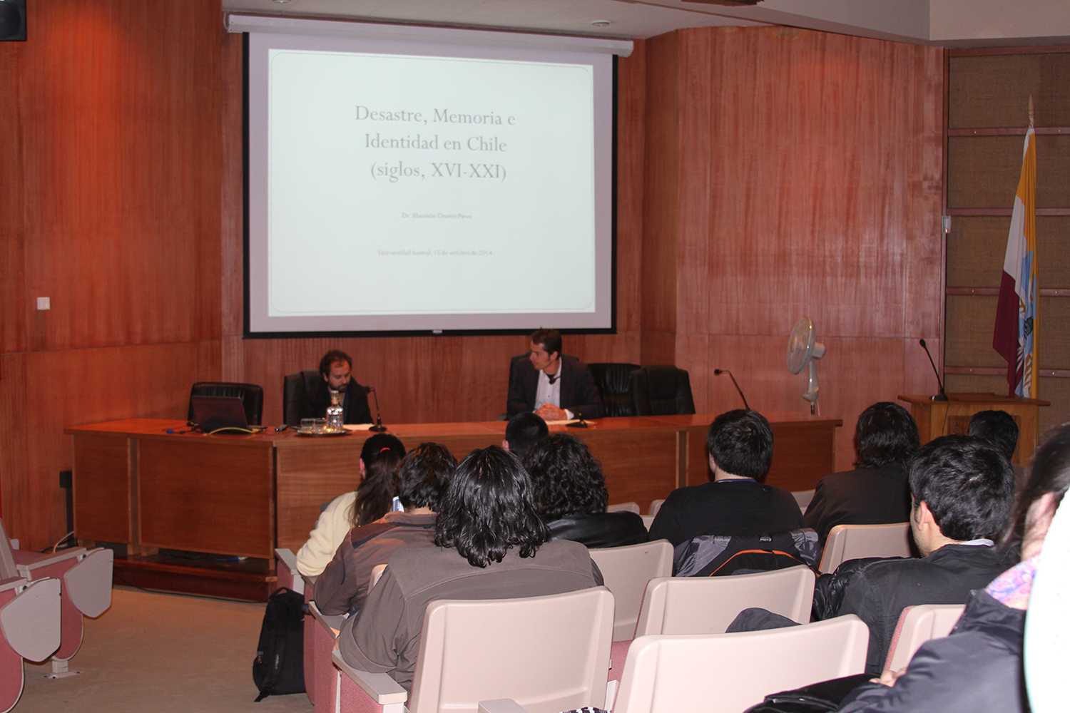 Para demostrar ello, el conferencista mostró a los asistentes cartas, imágenes y obras de arte que se hicieron a partir del terremoto de Santiago de 1647. Catástrofe que puso en duda el proyecto de la Conquista pues destruyó el eje de seguridad –Santiago- de la Colonia.