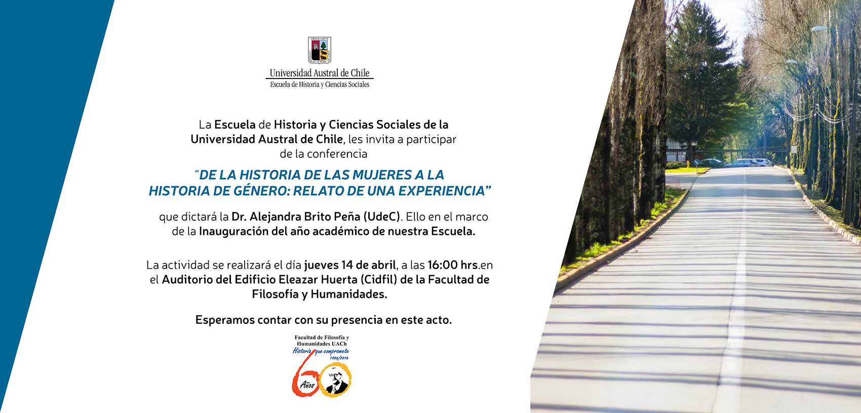 La Dra. Alejandra Brito Peña, docente de la Universidad de Concepción, visitará la UACh en el marco de la inauguración del año académico de la Escuela de Historia y Ciencias Sociales. La cita es este jueves 14 de abril a las 16 horas en el Auditorio del Edificio Eleazar Huerta Valcárcel -CIDFIL- de la Facultad de Filosofía y Humanidades.