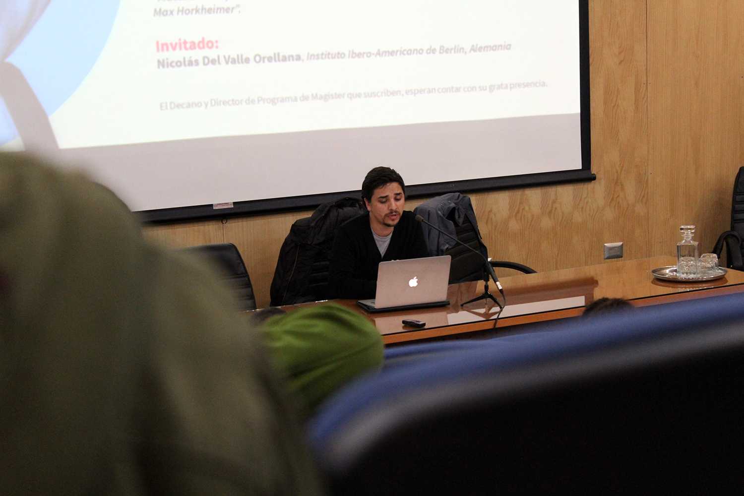 Los asistentes a la actividad presenciaron la conferencia que dictó Nicolás del Valle Orellana en donde comentó parte de su trabajo en el estudio del Materialismo y la Metafísica en la teoría crítica de Max Horkheimer. Del Valle fue editor del libro “La Actualidad de la Crítica. Ensayos sobre la Escuela de Frankfurt” (Metales Pesados: Santiago de Chile, 2015).
