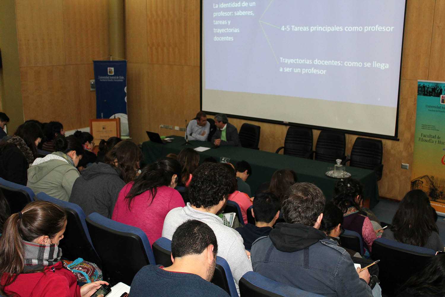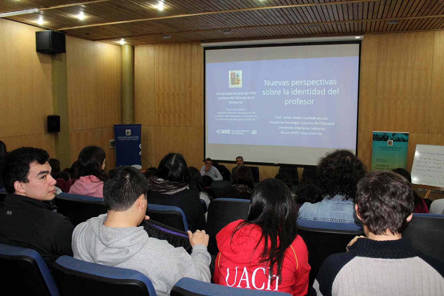 La primera actividad, realizada el jueves en el Auditorio del Edificio Eleazar Huerta de nuestra Facultad, se tituló “Nuevas perspectivas sobre la identidad del profesor” y significó un interesante diálogo con los estudiantes de las pedagogías que asistieron. El Dr. Badia les invitó a responder unas breves consultas sobre cuál es la idea que tienen de su profesión, cuáles serán sus tareas como profesores y cómo creen poder ser los mejores profesores del mundo.