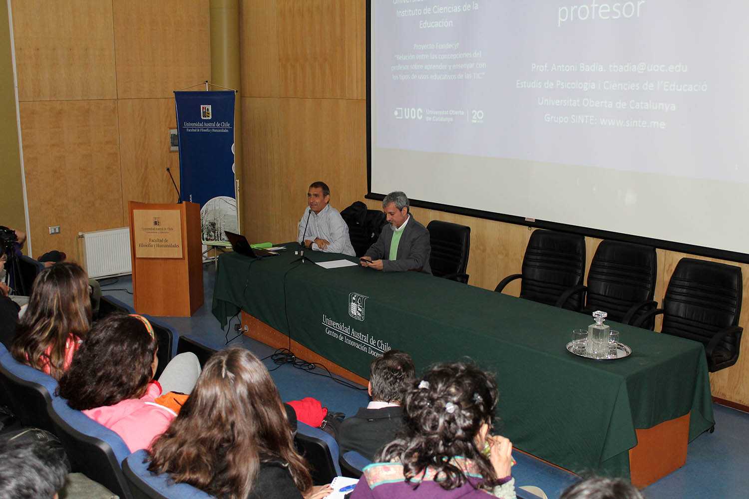 “Por otro lado, una cuestión relevante es que las tecnologías en si misma no producen ningún aprendizaje de contenidos o habilidades que persigue desarrollar cada disciplina escolar”, señaló Badia. Con varios ejemplos tomados del diálogo con los asistentes, el conferencista demostró que los aprendizajes que pensamos han sido obtenidos gracias a la tecnología no los son, pues siempre depende de la relación que se establezca con ella, por tanto de la propuesta didáctica que haga el profesor. El desafío para la investigación no es investigar sobre la tecnología si no que sobre el aprendizaje independiente del recurso que se utilice.