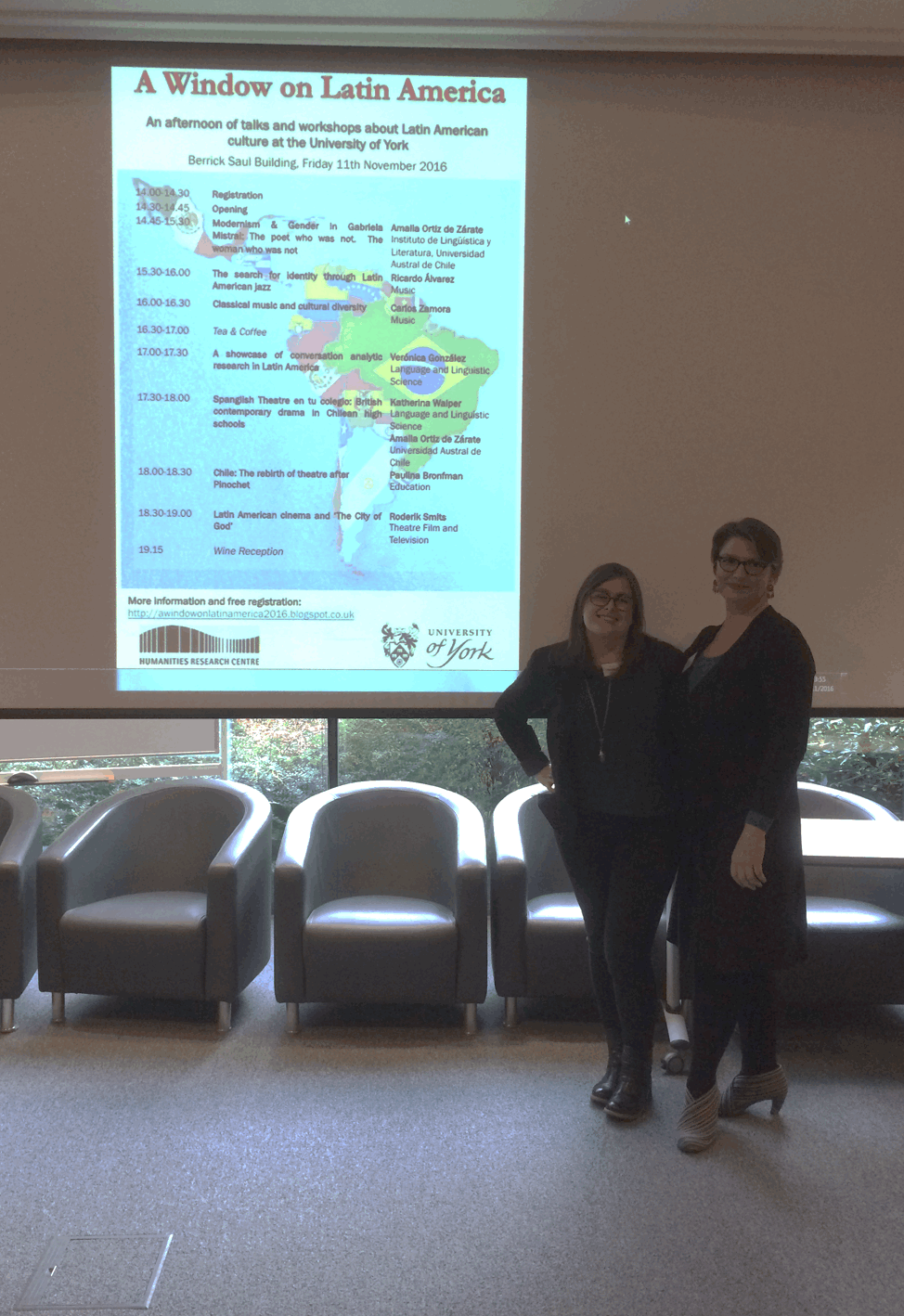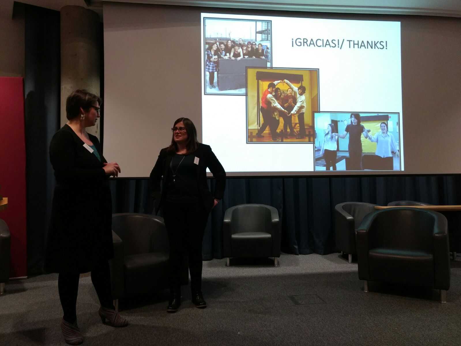 Además, ambas académicas, Walper y Ortiz de Zárate, presentaron una charla sobre las investigaciones desarrolladas en el marco de los proyectos de Vinculación con el Medio Spanglish Theatre en tu Colegio (2012, 2013, 2015), cuyos resultados fueron analizados en la tesis de pregrado de los estudiantes Carolina Fuentes y Ricardo Sáez (2016).