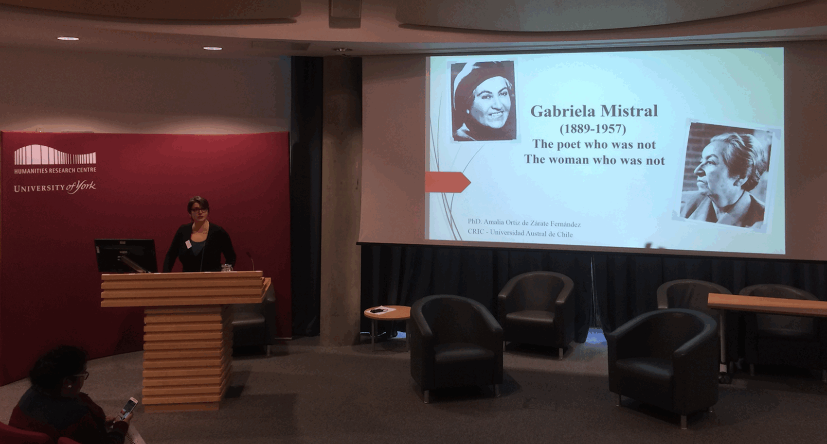 La Dra. Ortiz de Zárate fue la conferencista principal y realizó una sesión plenaria sobre la Poeta Chilena Gabriela Mistral, titulada “Gabriela Mistral: the poet who was not; the woman who was not.” Esta conferencia se gesta a partir del trabajo de mesa que la académica realizó como actriz, en torno al montaje Cartas (2015, Director Roberto Matamala), adaptación de la obra Longisland del dramaturgo Chileno Juan Claudio Burgos. En la conferencia se propuso un Movimiento Performativo como herramienta para adentrarse en la escritura Mistraliana y entregar nuevas interpretaciones a su poesía, prosa y correspondencia personal.