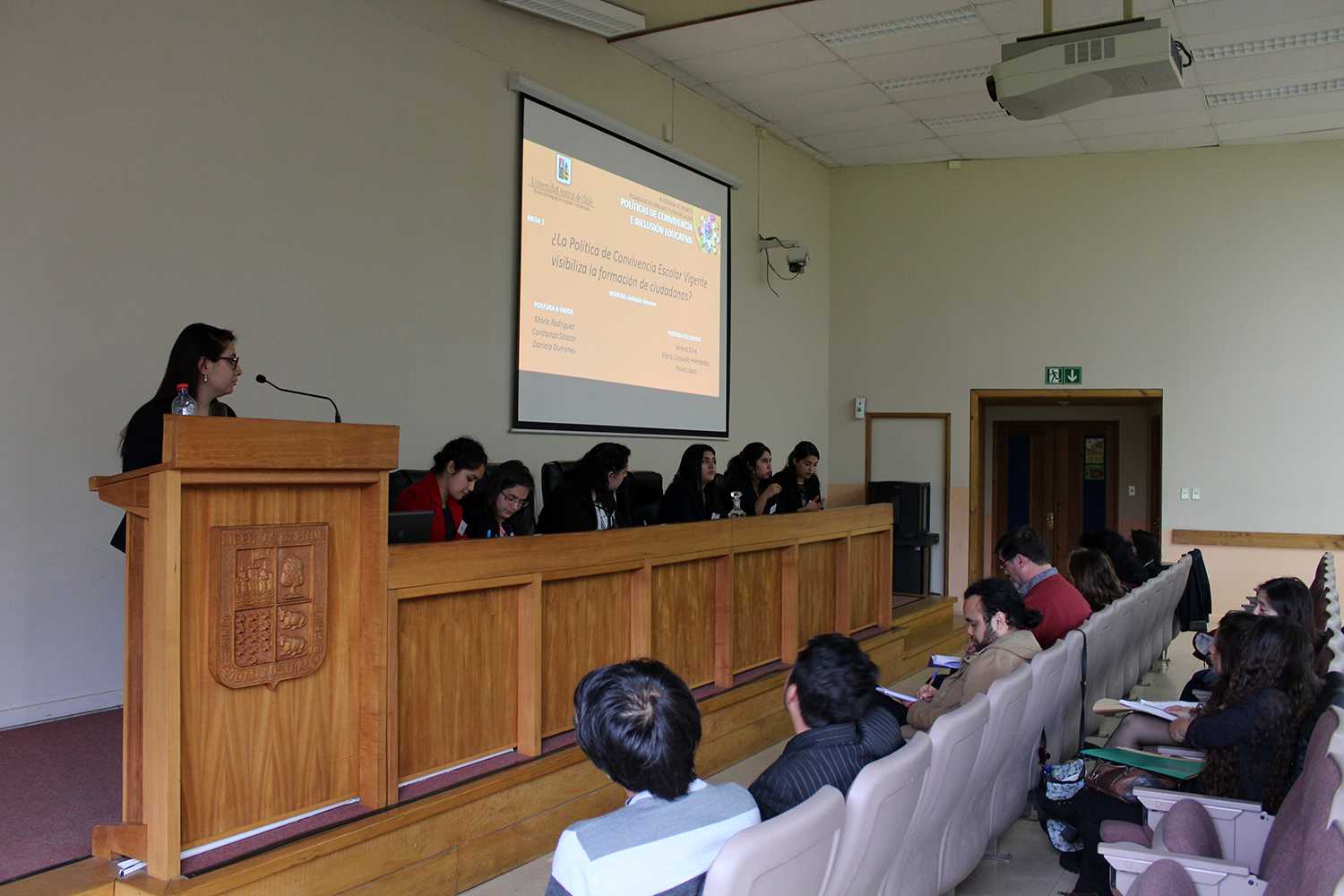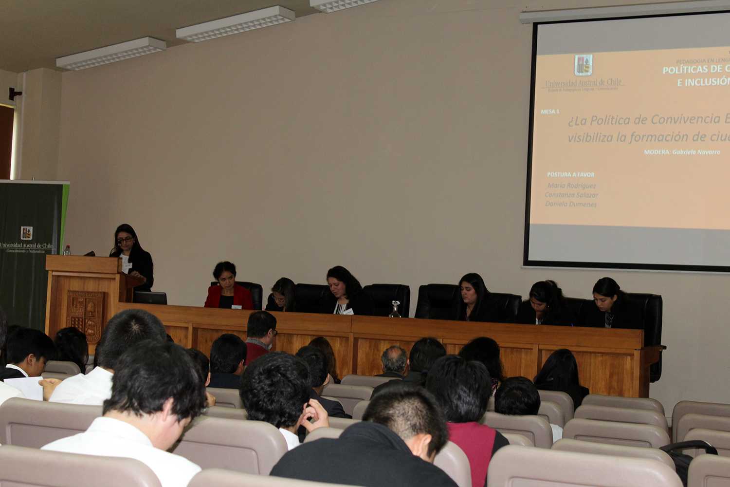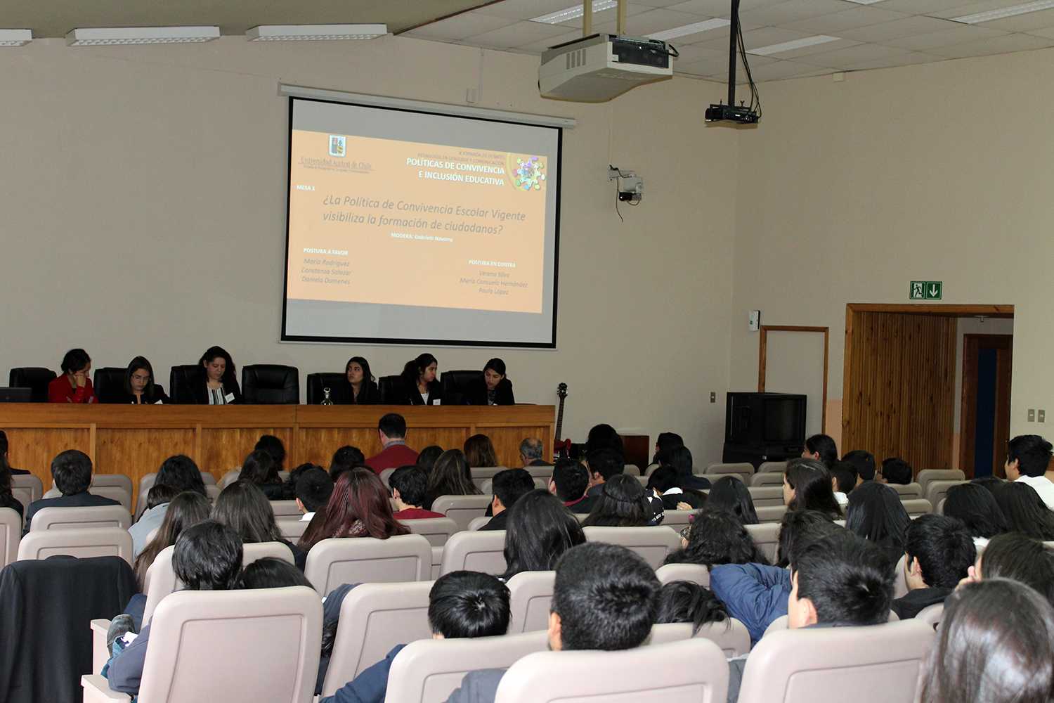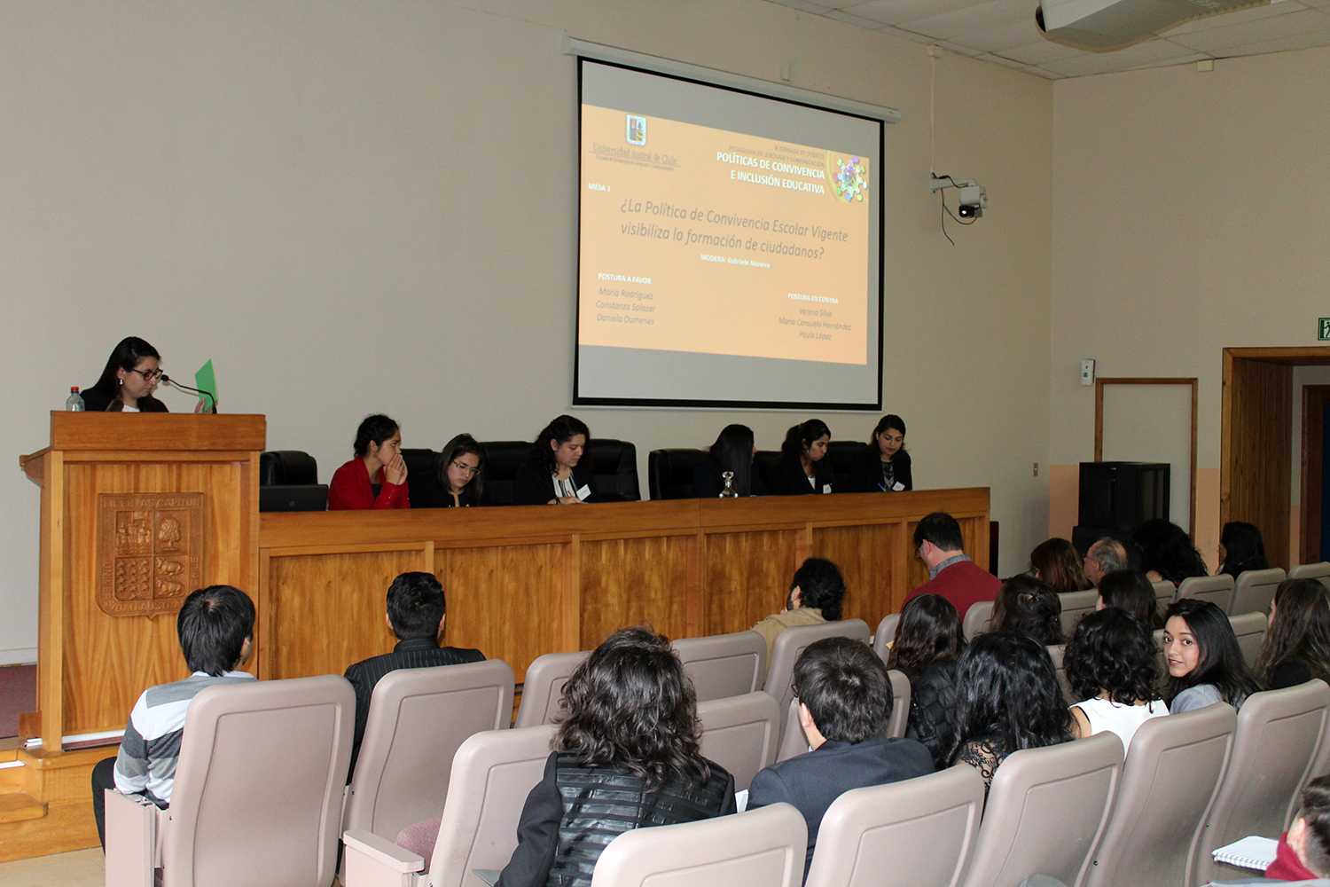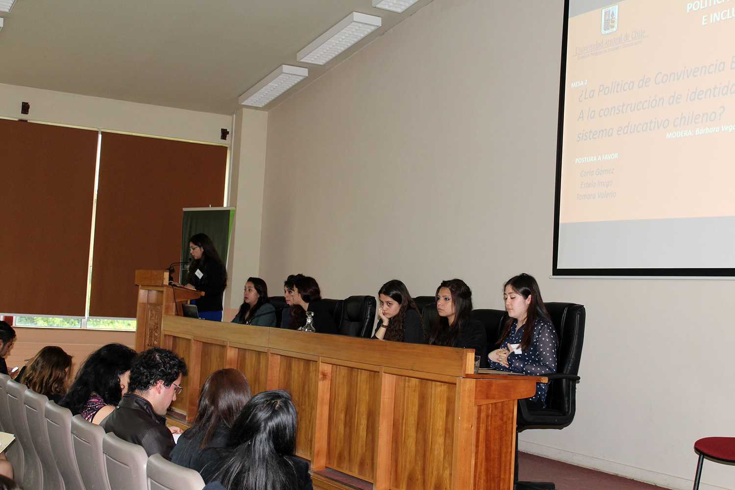 La primera mesa, titulada ¿La Política de Convivencia Escolar Vigente visibiliza la formación de ciudadanos?, fue moderada por Gabriela Navarro y debatieron Maira Rodríguez, Constanza Salazar y Daniela Dumenes a favor y Verena Silva, María Consuelo Hernández y Paula López en contra. El jurado estuvo compuesto por: Dr. Manuel Contreras, Dr. Alberto Galaz, Dra. © Elizabeth Martínez y Dra. Cecilia Rodríguez.