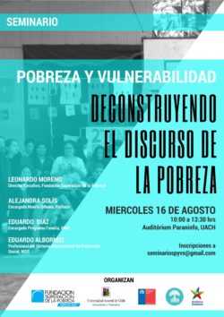 Este evento, primero de un conjunto de seminarios que se realizarán en el correr del año denominados “Pobreza y Vulnerabilidad”, se realizará el día 16 de agosto del año 2017, desde las 10:00 hasta las 13:00 horas, en la sala Paraninfo de la Universidad Austral de Chile, Campus Isla Teja.