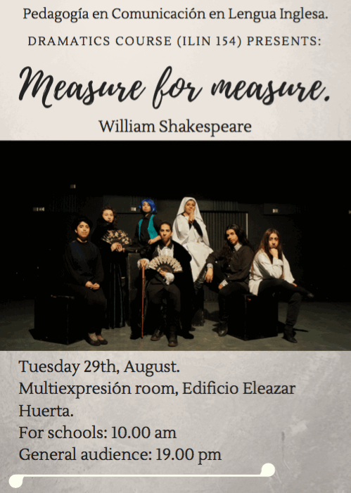 Como es tradición cada año el curso Dramatics (ILIN 154) de la carrera de Pedagogía en Comunicación en Lengua Inglesa montará una obra de teatro de William Shakespeare en inglés moderno original (el cual es un poco distinto al contemporáneo que hablamos hoy en día). En la oportunidad se desarrollará la obra llamada “Measure for Measure” (en español, Medida por Medida). Son los propios estudiantes del curso quienes adaptaron la obra original y le dieron forma.