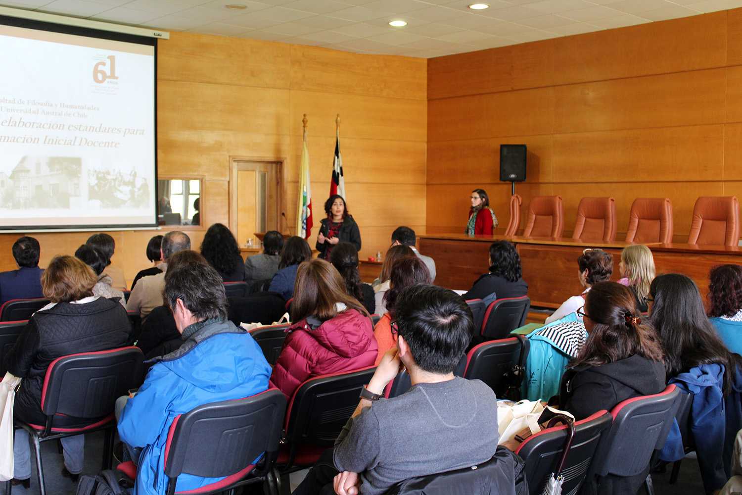 La Dra. Paulina Larroza, coordinadora académica convenio MINEDUC– UACh para la elaboración de estándares disciplinarios y coordinadora del Programa de Formación Pedagógica, presentó en detalle qué implica la elaboración de estándares para la formación inicial docente y como los futuros estudiantes de pedagogía tendrán mayores exigencias para acceder a las carreras pero también una preparación más completa para el ejercicio de la docencia.