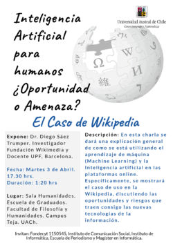 Para el día 3 de abril está programada la charla “Inteligencia Artificial para humanos ¿Oportunidad o Amenaza? / El caso de Wikipedia”, actividad que brindará una explicación general sobre cómo se está utilizando el aprendizaje de máquina (Machine Learning) y la Inteligencia artificial en las plataformas online. Específicamente, se mostrará el caso de uso en la Wikipedia, discutiendo las oportunidades y riesgos que traen consigo las nuevas tecnologías de la información.