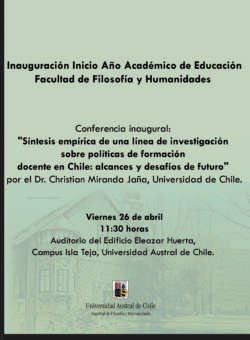 El Magíster en Educación, mención Política y Gestión Educativa junto al Instituto de Ciencias de la Educación, invitan a la Inauguración de Inicio de Año Académico del área de Educación de la Facultad de Filosofía y Humanidades de la Universidad Austral de Chile.