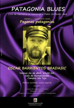Asimismo, este viernes 26 a las 19:00 horas, lanzará en Valdivia su novela Paganas patagonias (LOM Ediciones), también en la Sala de Humanidades y siendo presentado por Estela Imigo. Con esta actividad se inaugura el el Ciclo de Narrativa “PATAGONIA BLUES” (en homenaje a Pedro Guillermo Jara), organizado en conjunto por el Instituto de Lingüística y Literatura, el Instituto de Filosofía y el Magíster en Literatura Hispanoamericana Contemporánea.