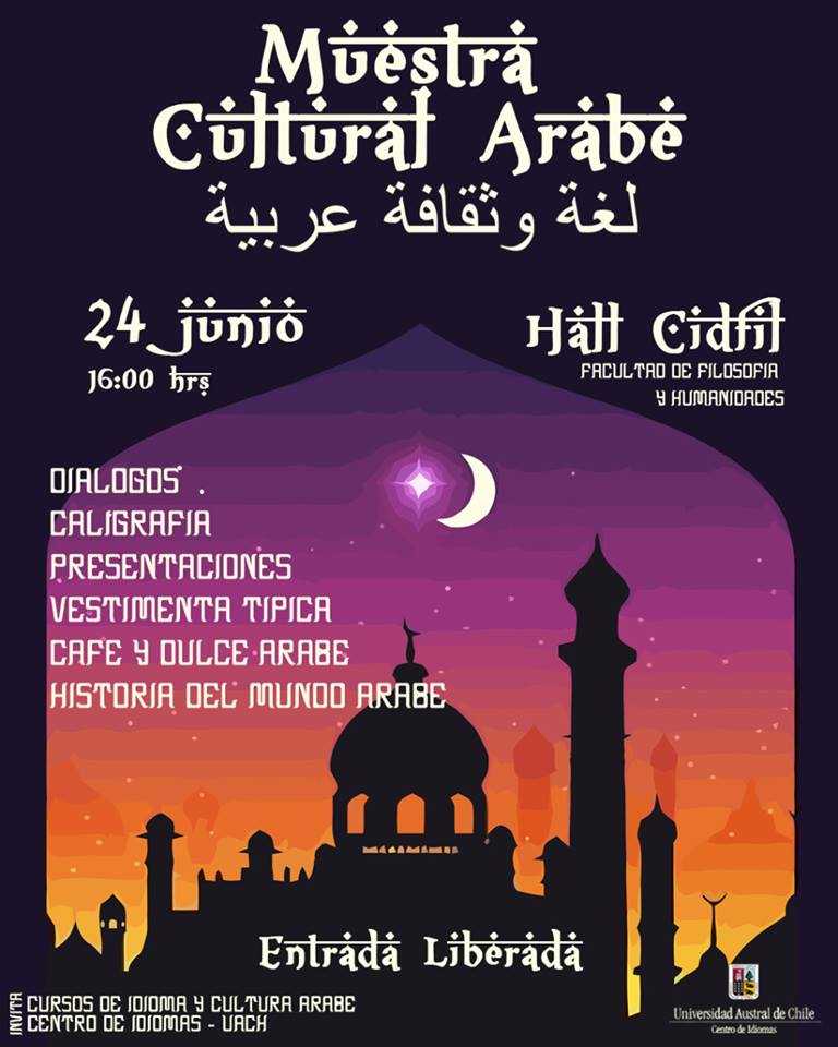 Las y los alumnos de los cursos de árabe del Centro de Idiomas UACh preparan la “Muestra Cultural Árabe”, la cual se llevará a cabo el próximo lunes 24 de junio, desde las 16:00 horas en el hall del Edificio Eleazar Huerta de la Facultad de Filosofía y Humanidades.