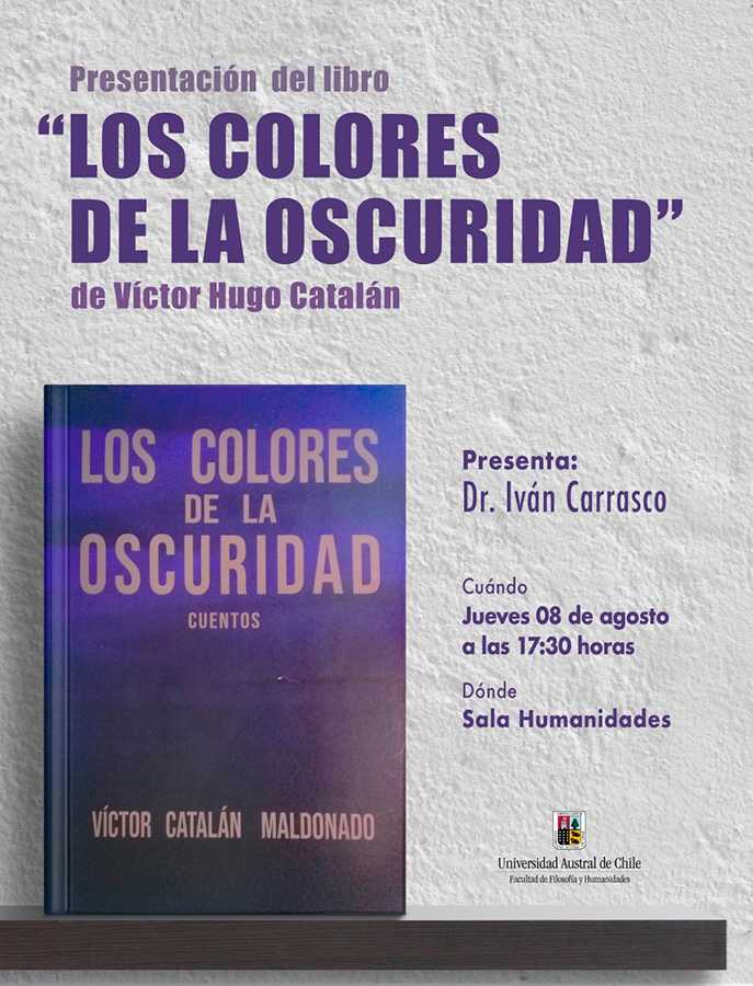 La Facultad de Filosofía y Humanidades de la Universidad Austral de Chile, a través de su Coordinación de Vinculación con el Medio, invita a la comunidad local a participar de la presentación del libro de cuentos “Los colores de la oscuridad”, del escritor, profesor normalista y médico cirujano, Víctor Hugo Catalán.