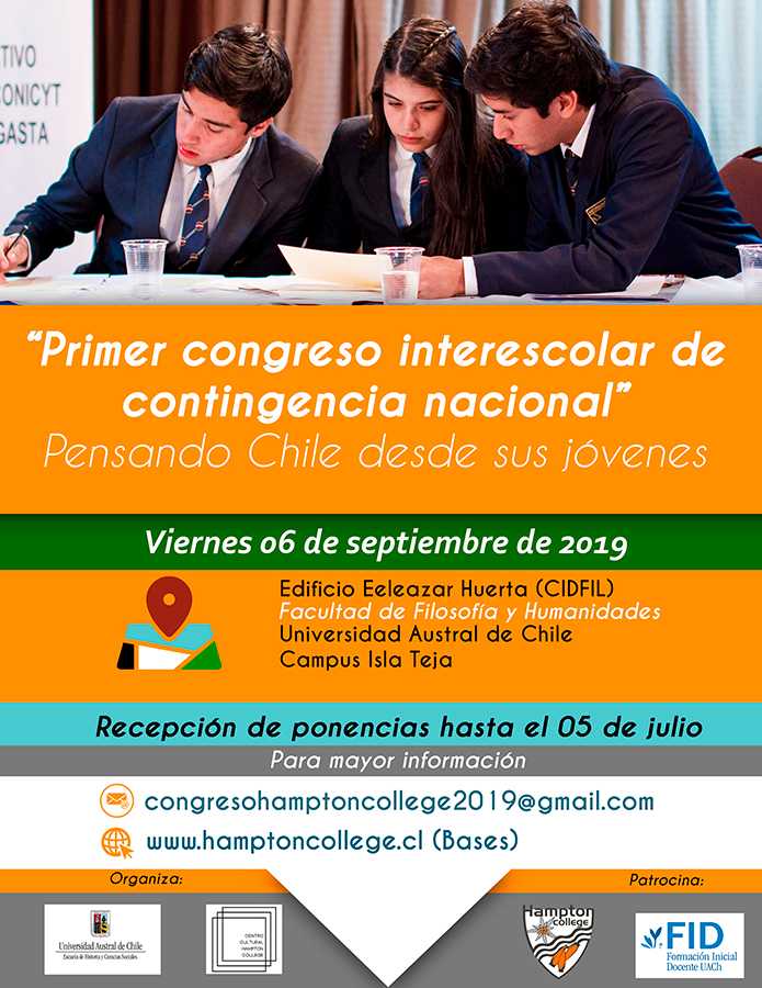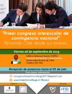 La Escuela de Historia y Ciencias Sociales de la Universidad Austral de Chile en conjunto con la comunidad educativa Hampton College, Valdivia, Región de Los Ríos, a través de su Centro Cultural, invitan a asistir al “Primer Congreso Interescolar de Contingencia Nacional: Pensando Chile desde sus jóvenes”, que se realizará el día 06 de septiembre de 2019 en la Facultad de Filosofía y Humanidades de la UACh, Campus Isla Teja.