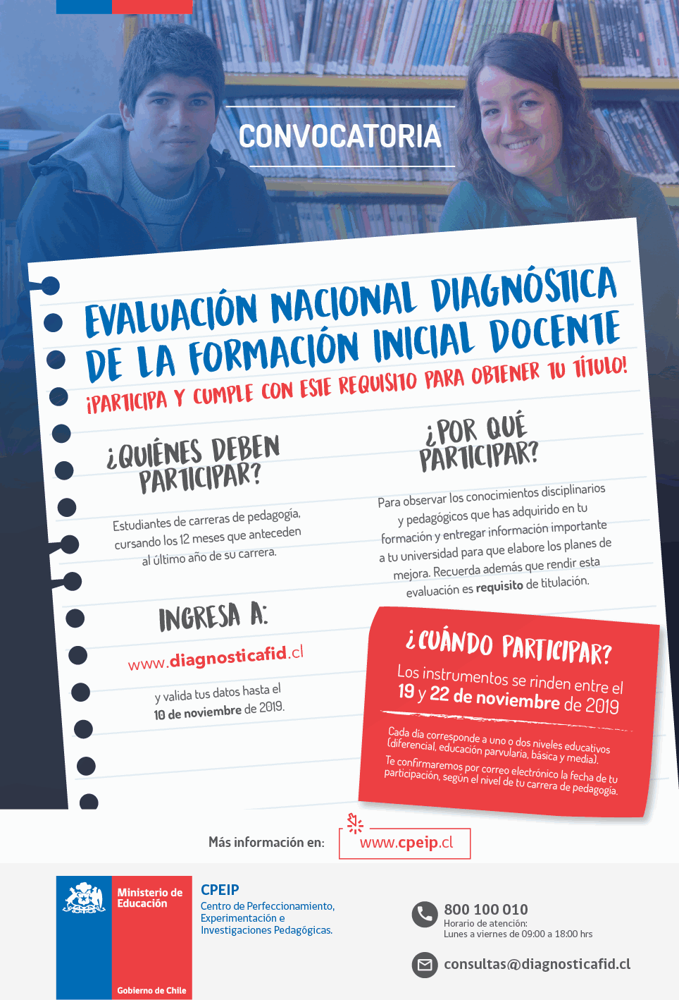 El lunes 21 de octubre, a las 15:50 horas, se realizará una jornada informativa a los y las estudiantes de las carreras de pedagogía que deben rendir la Evaluación Nacional Diagnóstica, entre los días 19 y 22 de noviembre próximos. La jornada se realizará en el auditorio Eleazar Huerta para todos y todas las estudiantes que se encuentran cursando el penúltimo año de la carrera.