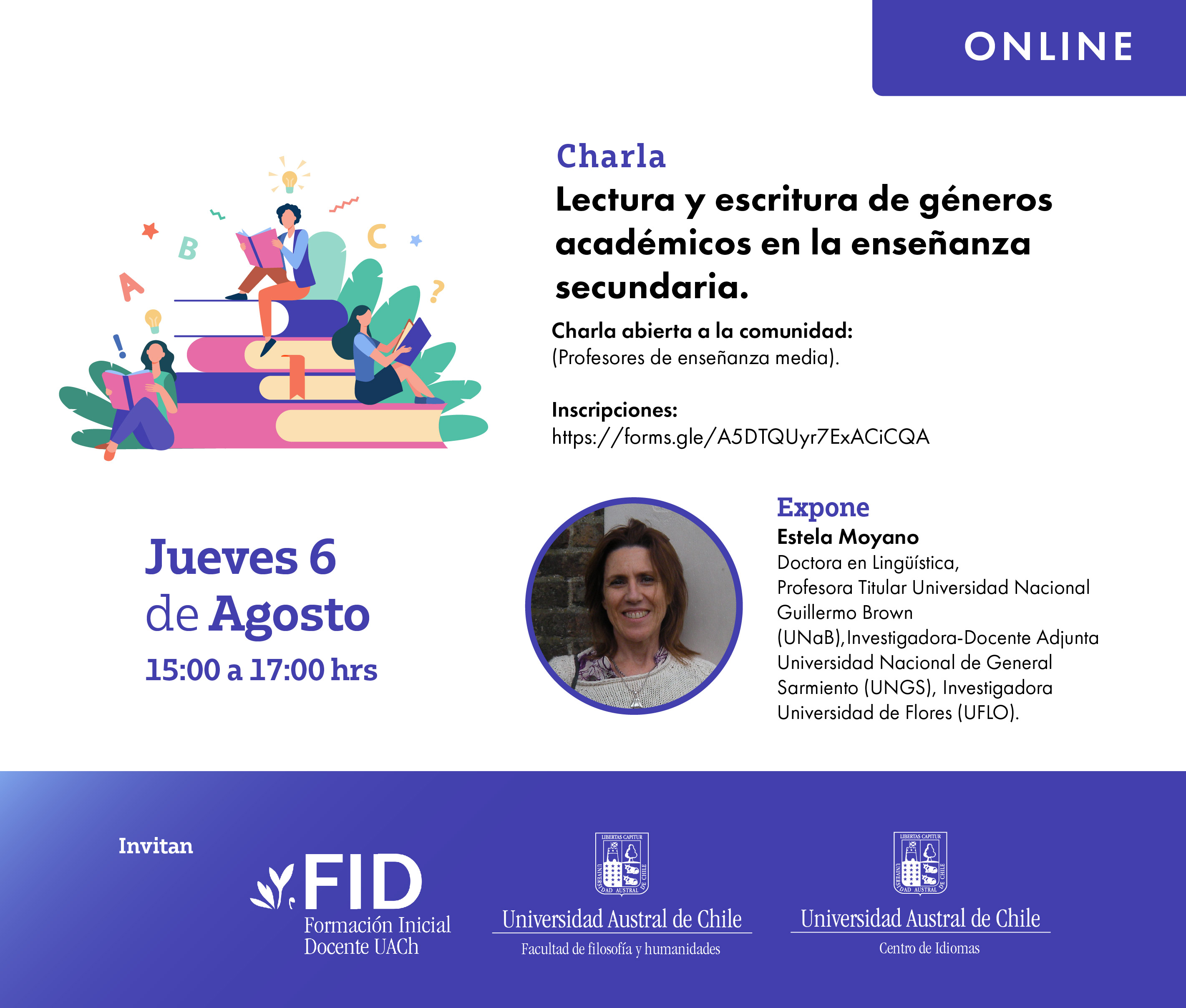 El Centro de Idiomas de la Facultad de Filosofía y Humanidades en conjunto con el Plan de Implementación del Programa de Fortalecimiento de la Formación Inicial Docente invitan a la charla abierta: Lectura y escritura de géneros académicos en la enseñanza secundaria dictada por la Dra. en Lingüística Estela Moyano que se realizará el próximo jueves 6 de agosto de 15:00 a 17:00 hrs vía zoom.