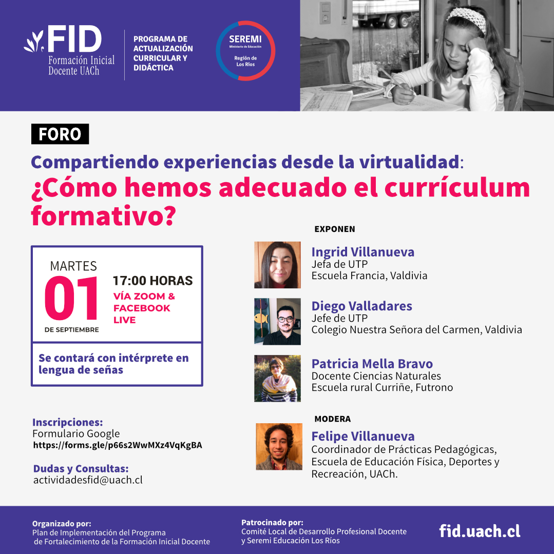 El Plan de Implementación del Programa de Fortalecimiento de la Formación Inicial Docente y la Coordinación de prácticas pedagógicas de la Universidad Austral de Chile en conjunto con el Comité Local de Desarrollo Profesional Docente de la Seremi de Educación Los Ríos, le extiende la invitación a participar del tercer foro del Programa de Actualización Curricular y Didáctica, denominado: “Compartiendo experiencias desde la virtualidad. ¿Cómo hemos adecuado el currículum formativo?”