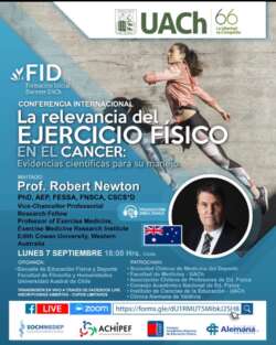 La Escuela de Educación Física, Deportes y Recreación de la Universidad Austral de Chile, invita a la Conferencia Internacional: La relevancia del ejercicio Físico en el Cáncer: Evidencias científicas para su manejo, esta actividad académica, será impartida por el Dr. Robert Newton desde Australia. La conferencia, se realizará el lunes 7 de septiembre, 18:00 hrs de Chile (vía zoom) y es parte del programa institucional del 66ª Aniversario de nuestra casa de estudios.
