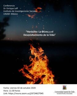 El Programa de Magíster en Pensamiento Contemporáneo de la Facultad de Filosofía y Humanidades UACh, invita a la comunidad a participar de la conferencia titulada “Heráclito: La Φύσις y el Desocultamiento de la Vida” que impartirá el académico del Instituto de Investigaciones Sociales de UNAM, México, Dr. Enrique Leff, este viernes 02 de octubre a través de la plataforma zoom.
