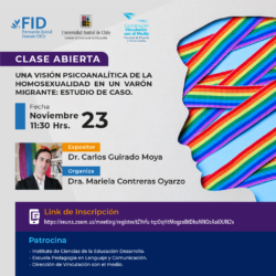 El curso Aprendizaje y Sistema de Conocimientos ICED 071 a cargo de la profesora Mariela Contreras invita a la Clase Abierta: Una visión psicoanalítica de la homosexualidad en un varón migrante: estudio de un caso, que dictará el Dr. Carlos Guirado Moya. La actividad se realizará el día lunes 23 de noviembre a las 11:30 horas y será transmitida por el Fanpage de la Facultad de Filosofía y Humanidades.