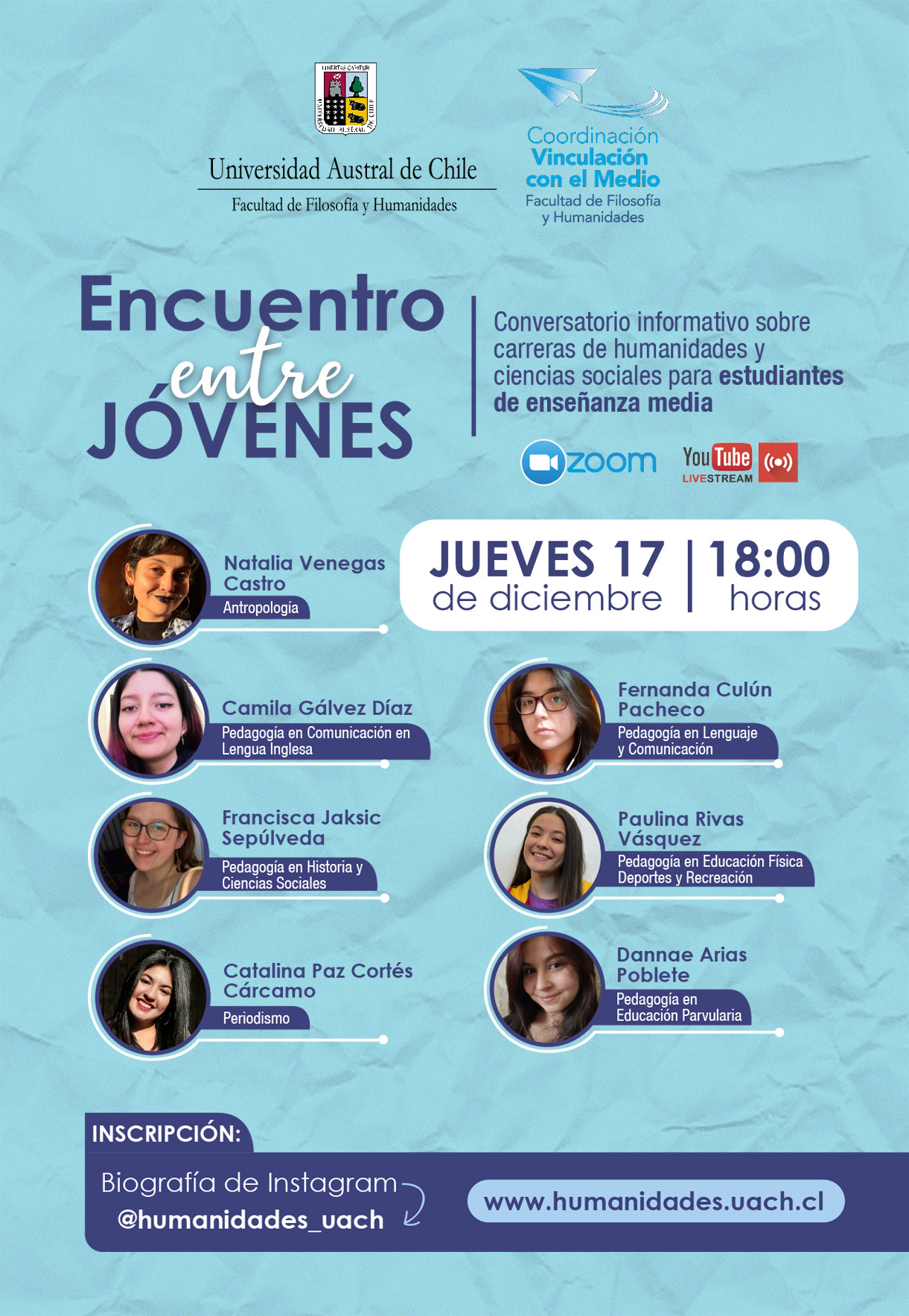 La Facultad de Filosofía y Humanidades de la Universidad Austral de Chile (UACh), invita a estudiantes de primero a cuarto medio de establecimientos de todo el país a participar de un “Encuentro entre Jóvenes. Conversatorio informativo sobre carreras de humanidades y ciencias sociales”.