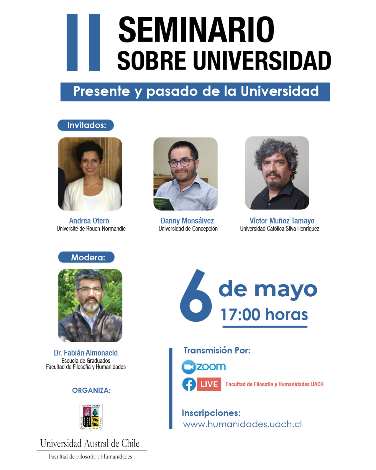 El II Seminario sobre Universidad se realizará el próximo jueves 6 de mayo, a las 17:00 horas a través de la plataforma zoom y será transmitido por Facebook Live de la Facultad de Filosofía y Humanidades.