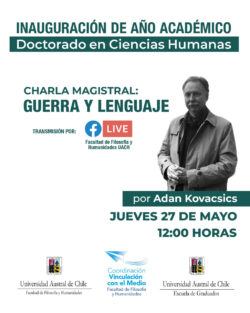 La Escuela de Graduados de la Facultad de Filosofía y Humanidades invita a la comunidad universitaria a participar de la Inauguración de Año Académico del programa de Doctorado en Ciencias Humanas, Mención Discurso y Cultura. En la oportunidad, la charla inaugural estará a cargo del destacado filólogo y traductor, Adan Kovacsics cuya exposición se denomina “Guerra y Lenguaje”.