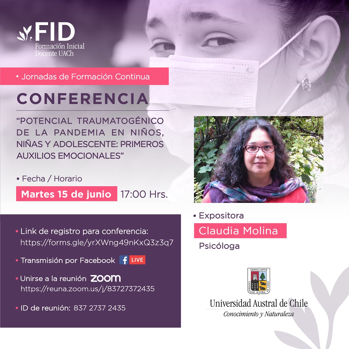 El programa de Formación Continua del Plan de Implementación del Programa de Fortalecimiento de la Formación Inicial Docente invita profesoras y profesores de establecimientos educacionales a la conferencia “ Potencial Traumático de la Pandemia en niños, niñas y adolescentes: Primeros Auxilios Emocionales”, dictado por la psicóloga Claudia Molina, la actividad se realizará el día 15 de junio a las 17:00 horas vía zoom y será transmitida por Facebook Live de la Facultad de Filosofía y Humanidades.