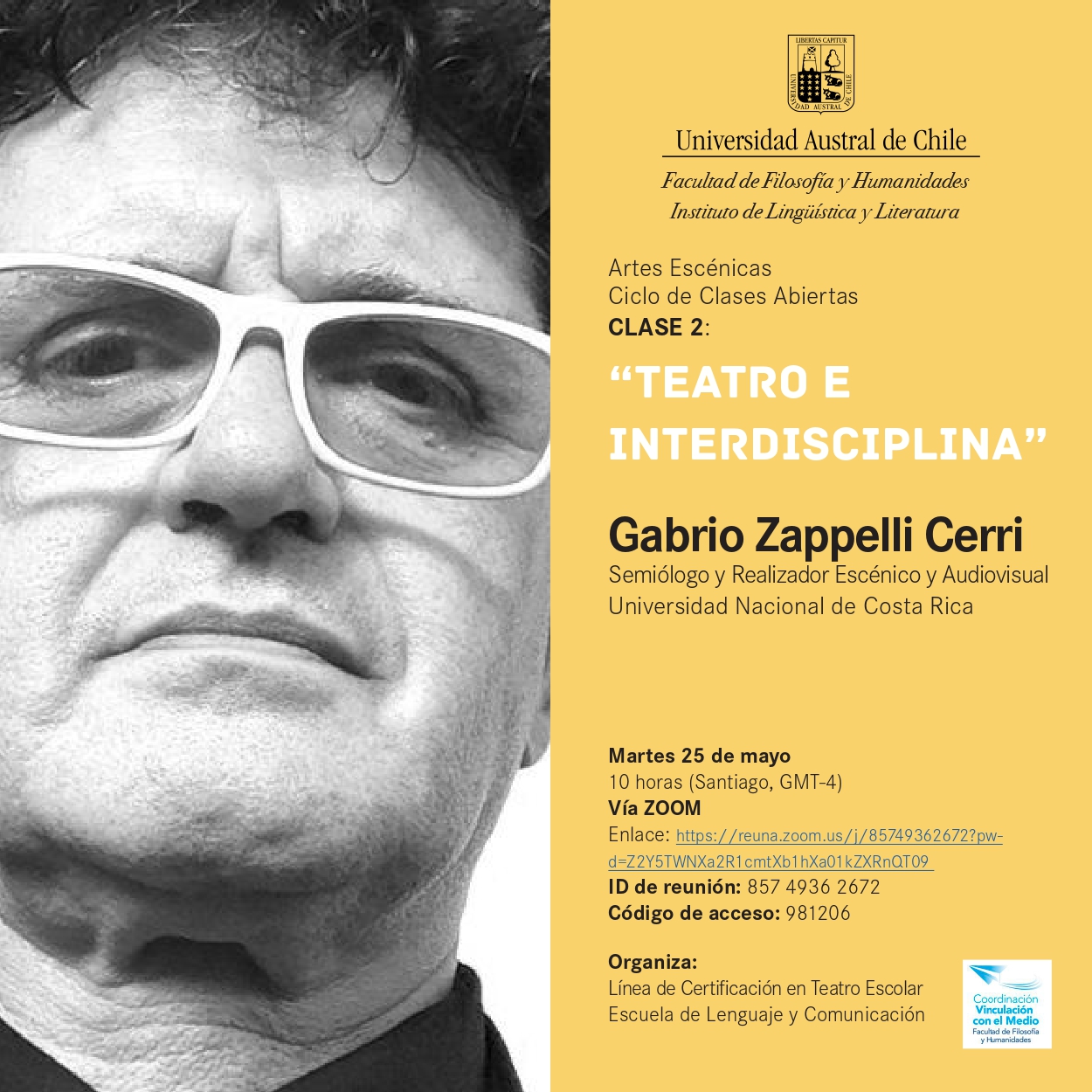 En esta oportunidad, la clase estuvo a cargo de Gabrio Zappelli Cerri, académico y multicreador (teatrista, cineasta, artista visual, escritor), quien abordó el tema “Teatro e Interdisciplina”. El también semiólogo compartió su experiencia enseñando materias relativas a las artes escénicas en carreras de teatro, danza, cine, televisión, animación, diseño, publicidad y comunicación; y como artista que ha transitado por diversos lenguajes buscando integrarlos.