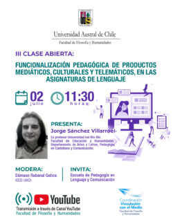 Luego de dos exitosas jornadas virtuales, este viernes 02 de julio, se llevará a cabo la tercera y última clase abierta de la asignatura la asignatura ‘Didáctica II: literatura-lengua y medios’ de la carrera de Pedagogía en Lenguaje y Comunicación.