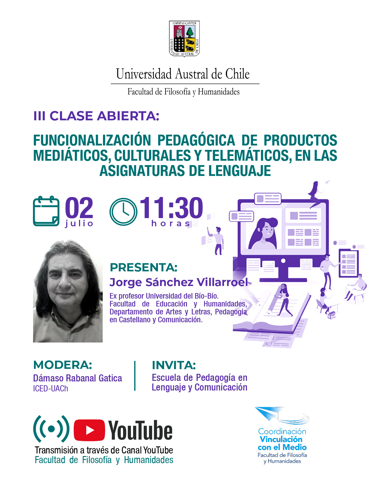 En esta oportunidad, el expositor invitado es el ex profesor Universidad del Bío-Bío, Jorge Sánchez Villarroel, quien realizará la conferencia titulada “Funcionalización pedagógica de productos mediáticos, culturales y telemáticos, en las asignaturas de Lenguaje”.