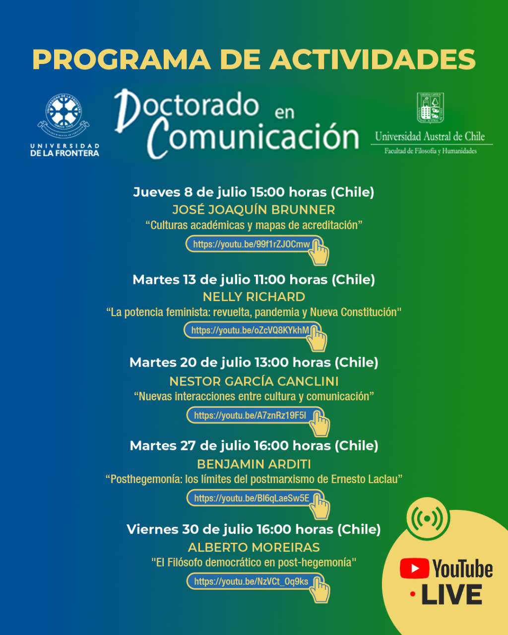 El pasado martes 29 de junio, comenzó el ciclo de conferencias organizado estudiantes de primer año del programa de Doctorado en Comunicación de la Universidad de la Frontera (UFRO) y Universidad Austral de Chile (UACh), cuyo fin es instaurar dentro de la comunidad reflexiones en torno a los procesos de democratización e institucionalidad propiciados la Convención Constitucional, tomando en cuenta imaginarios culturales, comunicacionales y políticos, analizados por diversos actores, académicos e intelectuales.