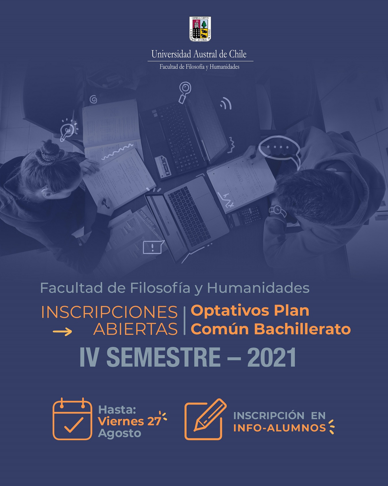 Las y los estudiantes de las carreras de Periodismo, Antropología, Pedagogía en Lenguaje y Comunicación, Pedagogía en Comunicación en Lengua Inglesa, Pedagogía en Educación Física Deportes y Recreación, Pedagogía en Historia y Ciencias Sociales y Pedagogía en Educación Parvularia, podrán escoger entre nueve alternativas optativas entre el lunes 16 al viernes 27 de agosto a través de la plataforma Info-Alumnos.