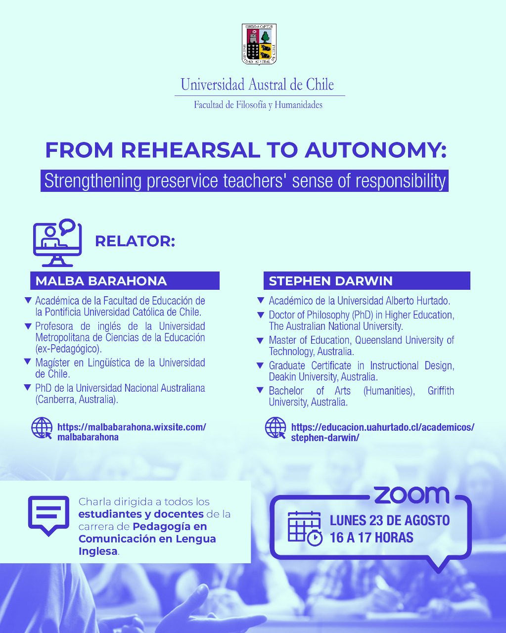 La Escuela de Pedagogía en Comunicación en Lengua Inglesa invita a los estudiantes de todas sus generaciones y docentes de la carrera a participar de una charla a cargo de los destacados académicos Malba Barahona y Stephem Darwin, programada para el día lunes 23 de agosto a partir de las 16:00 horas.