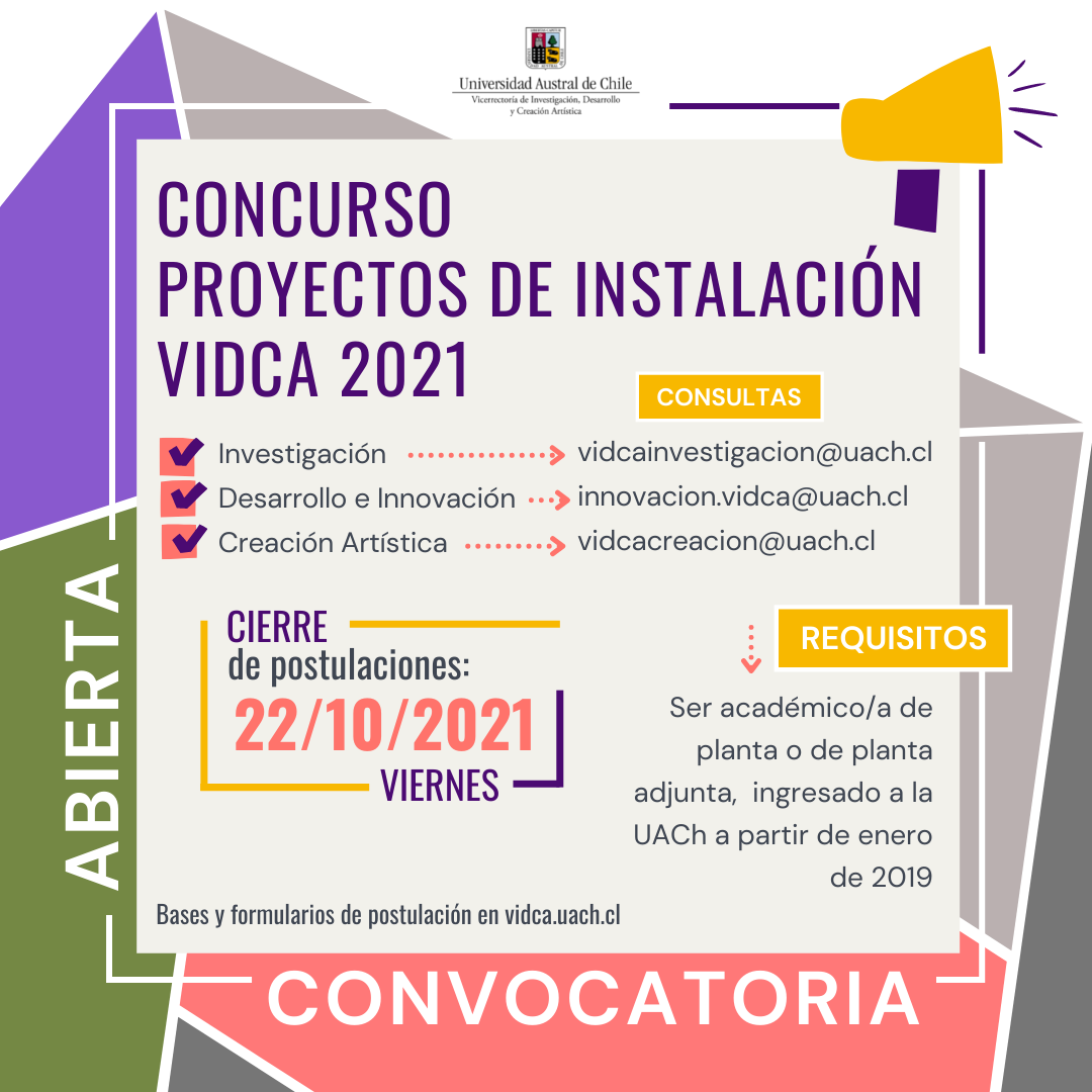 La Vicerrectoría de Investigación, Desarrollo y Creación Artística (VIDCA) abre la convocatoria a su “Concurso Proyectos de Instalación VIDCA”, para académicos/as contratados desde enero de 2019 a la fecha, cuya postulación estará abierta hasta el 22 de octubre 2021.