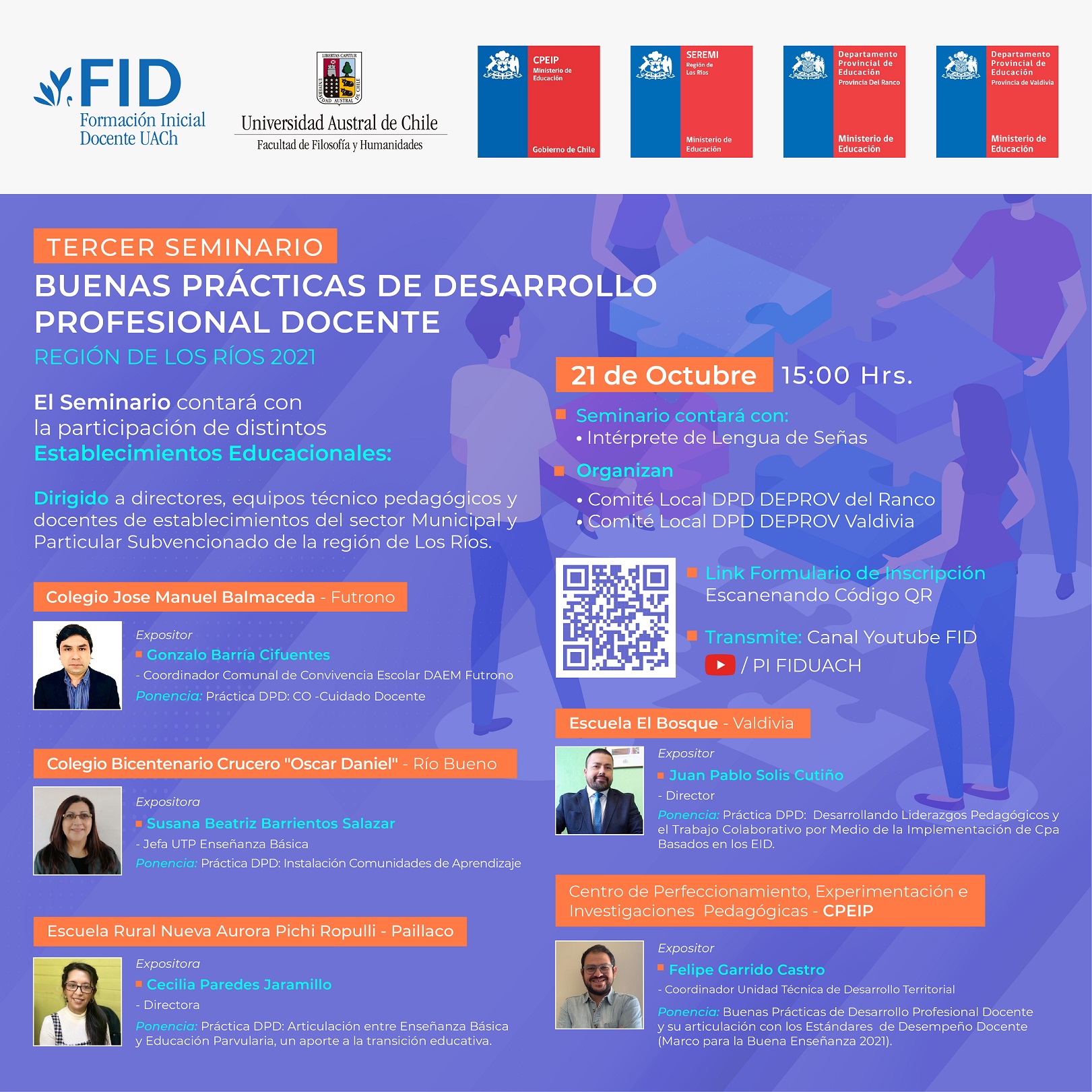 La Secretaria Ministerial de Educación de Los Ríos, el Centro de Perfeccionamiento Experimentación e Investigaciones Pedagógicas CPEIP, los Comités Locales de Desarrollo Profesional Docente y el Plan de Implementación del Programa de Fortalecimiento de la Formación Inicial Docente invitan al “Tercer Seminario de Buenas Prácticas de Desarrollo Profesional Docente región de Los Ríos 2021” que se realizará de manera virtual vía zoom el día 21 de octubre a las 15:00 horas y será transmitido por el canal de Youtube del PI FID.