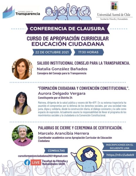 En el marco del cierre del Curso Apropiación Curricular Educación Ciudadana se invita a la Conferencia de cierre llamada “Formación Ciudadana y Convención Constitucional” que será dictada por Aurora Delgado, Constituyente por el Distrito 24 región de Los Ríos. La actividad se realizará el día viernes 22 de octubre a las 17:30 horas vía zoom y será trasmitido por el Facebook Live de la Facultad de Filosofía y Humanidades.