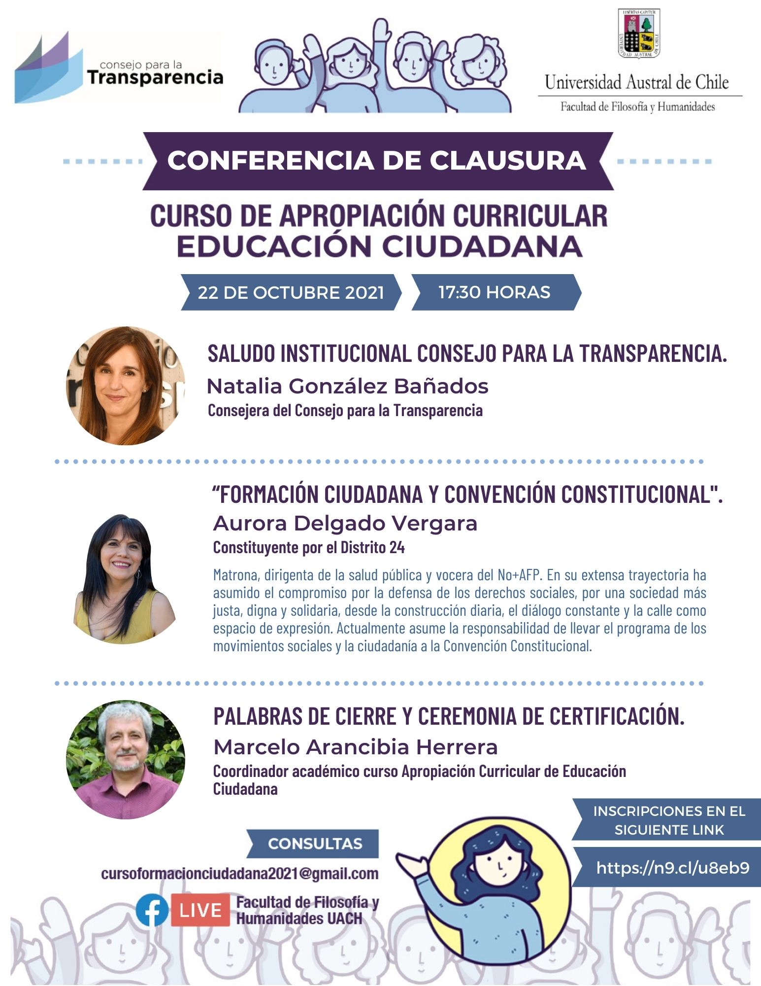 La actividad contará con la presencia de Natalia González Bañados del Consejo para la Transparencia, quién entregará un saludo inicial en la actividad, seguido de la ceremonia de cierre y entrega de certificados dirigida por el coordinador académico del Curso de Apropiación Curricular y Formación Ciudadana, Dr. Marcelo Arancibia, finalizando con la conferencia de la Convencional Constituyente Aurora Delgado.